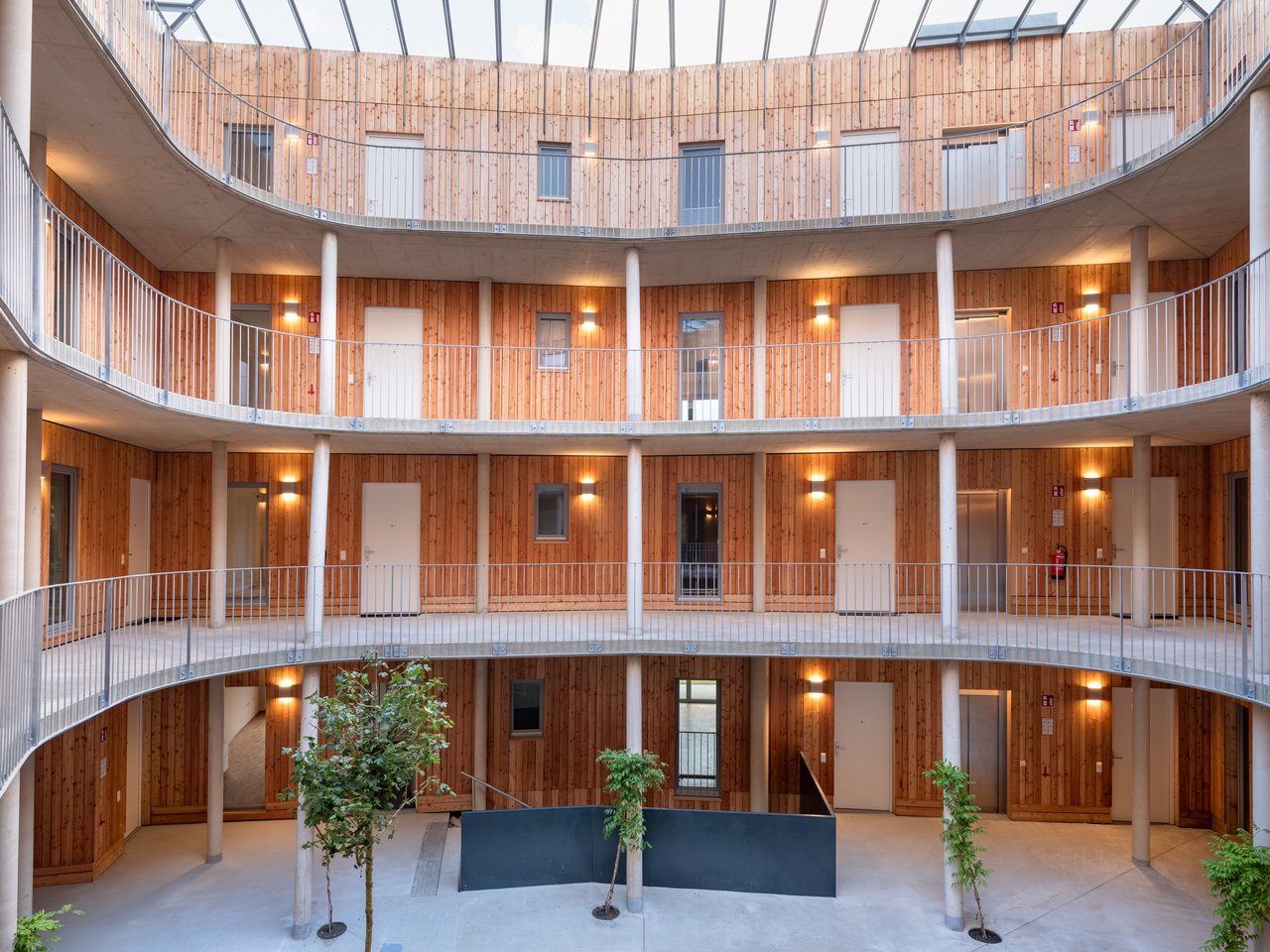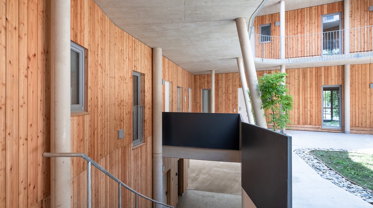 Quality and affordable living in a subsidised social housing project made of wood? It’s possible! The City of Graz (AT) proved this with its Max-Mell-Allee building project put up in the popular Rosenhain local recreation area. The four-storey timber construction was erected on a triangular site directly adjacent to the college district. The site's geometry gave the innovative residential building project its unusual shape reminiscent of a rotary engine or plectrum. Its 38 subsidised rental flats with projecting loggias and balconies all around are arranged around a closed courtyard with a reinforced concrete arcade, with the arcade not carrying the building's load. It merely hugs the efficient solid wood superstructure. Located underneath is a conventional basement floor with underground carpark, bicycle parking and cellar rooms.