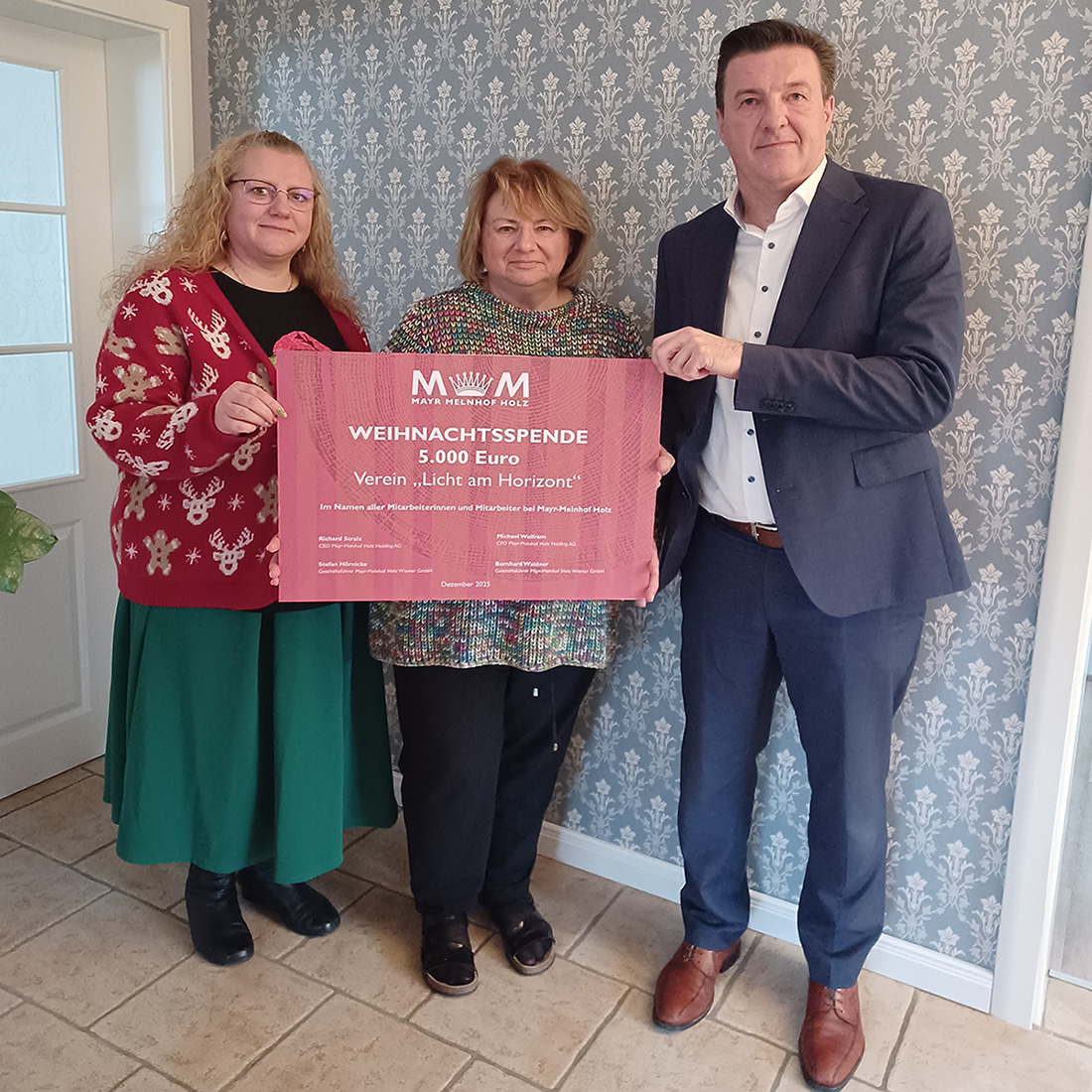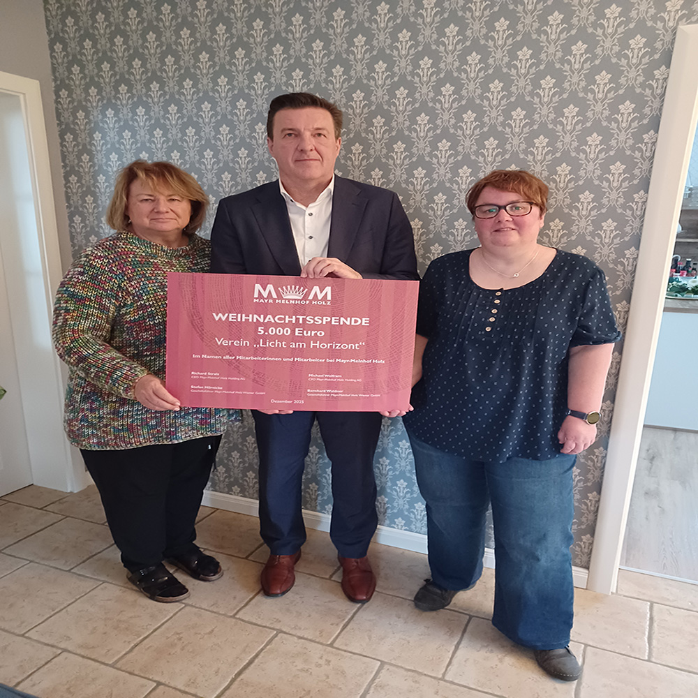 Im Namen aller Mitarbeiterinnen und Mitarbeiter von Mayr-Melnhof Holz überreichten Stefan Hörnicke, Geschäftsführer MM Holz Wismar, und Julia Nietruk, Vertriebsinnendienst MM Holz Wismar, unsere MM Holz Weihnachtsspende 2025 an den Verein „Licht am Horizont“.